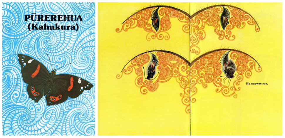 Image: Pūrerehua (Kahukura) cover & spread, written by Hirini and illustrated by Cliff Whiting in 1981. CC BY 2.0. Item from Archives New Zealand Te Rua Mahara o te Kāwanatanga.