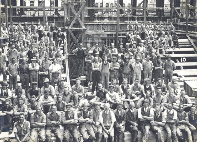Image: Fletcher Construction work team on site of Dunedin Post Office site, 1935. Copyright unknown. Item from Fletcher Trust.