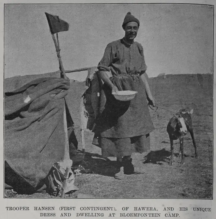 - Trooper Hansen (first contingent) of Hawera and his unique dress and dwelling at Bloemfontein camp