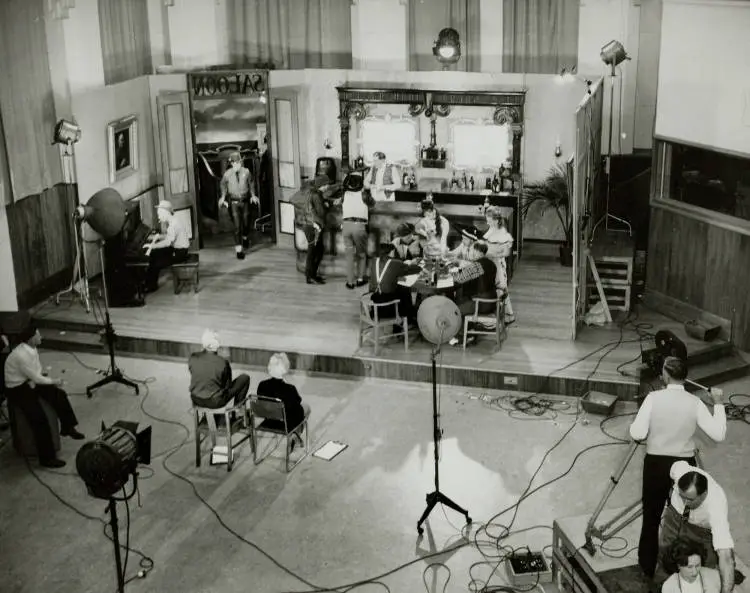 Ian Watkins directs a television commercial for Keans Jeans in the NZBS AKTV-2 studios in Shortland Street, Auckland (later the NZBC studios).