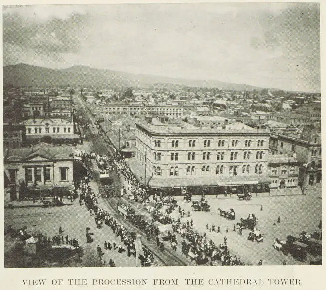 View of the procession from the Cathedral Tower during Labour Day in Christchurch.