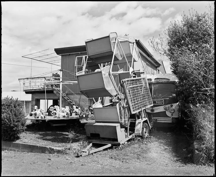 A house with a merry-go-round and ferris wheel in the front garden, and a bus parked beside the house. In Tripoli Road, Tamaki.