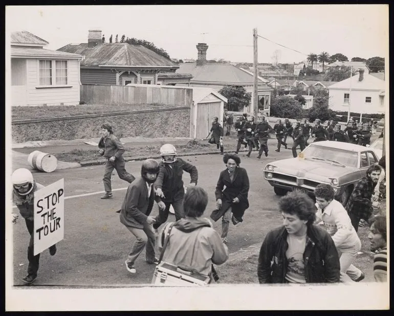 Anti-tour protestors and police in Molesworth Street, Wellington - Photograph taken by Ian Mackley